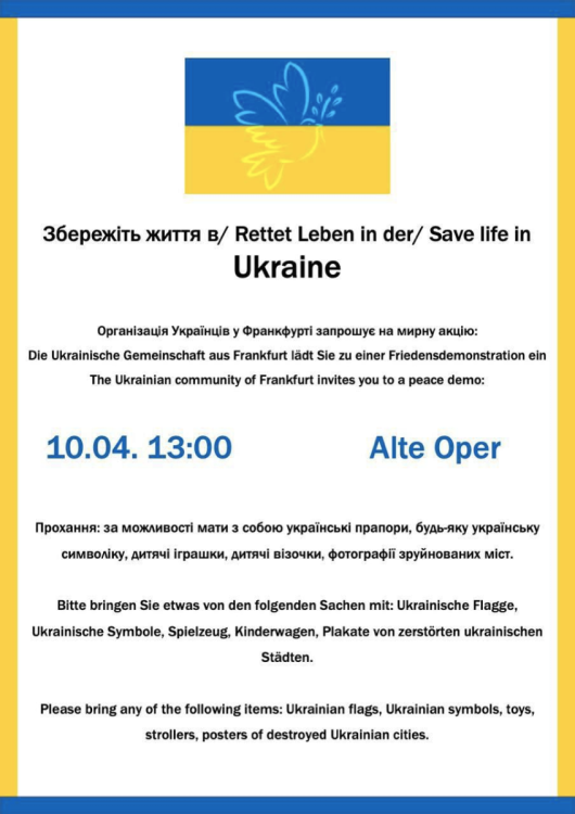 16. Організація українців у Франкфурті запрошує на мирну акцію. За можливості, мати з собою українскі прапори, будь-яку українську символіку, дитячі іграшки, дитячі візочки, фотографії зруйнованих міст. Місце та час проведення: 10.04 о 13:00 за адресою Opernpl. 1, 60313 Frankfurt am Main, Alte Oper.